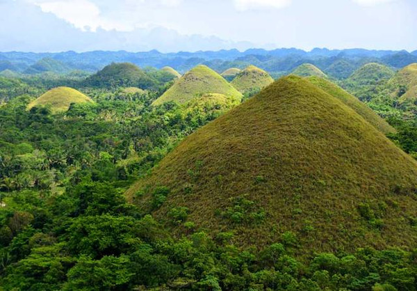 导游洪玮骏介绍说:所谓“巧克力山”,是由1268个面积相同的广阔区域、几近完美的圆锥形山丘组成,占地达50平方公里。如果从高地观景坪举目远眺,这些小山丘会呈现出棕褐色,就像平地上放着一颗颗大大小小的巧克力,非常有趣。特别是在空中俯瞰观赏的效果为最佳。