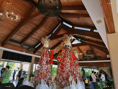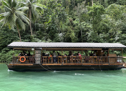 乘船顺流而下,两岸皆是质朴的民居,有时候也许你会碰到调皮的孩子冲你大喊一声,待游客目光转向他,便从岸边高大的椰子树上纵身跳下,然后从河中心冒出脑袋;也有漂亮的姑娘们在河边搭的竹台上弹着吉他,载歌载舞,热情欢迎每位游客的到来。