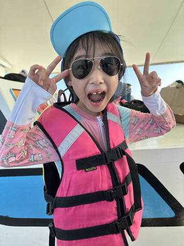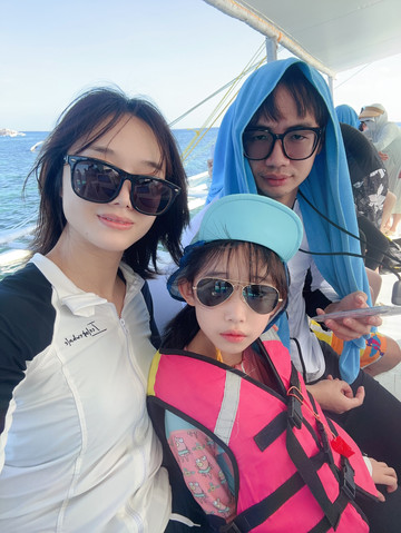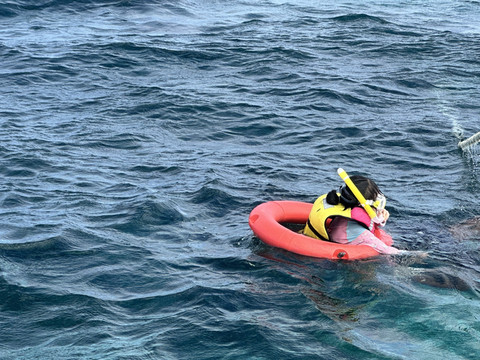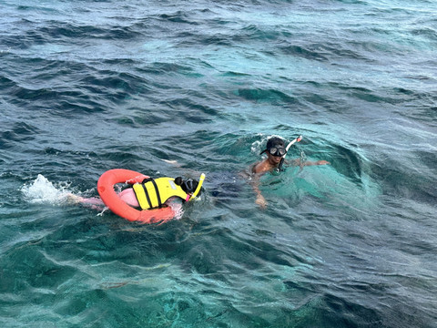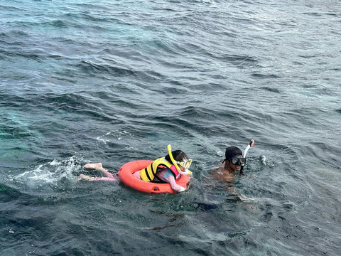 浮潜的时候,一个小黑带一个小朋友,非常安全!宝宝开心惨了