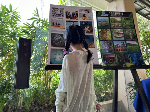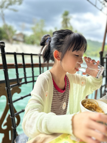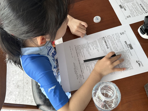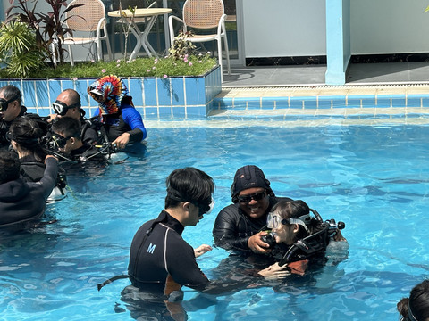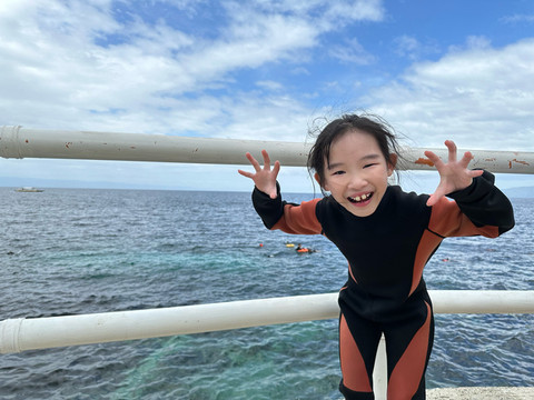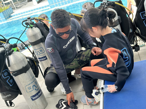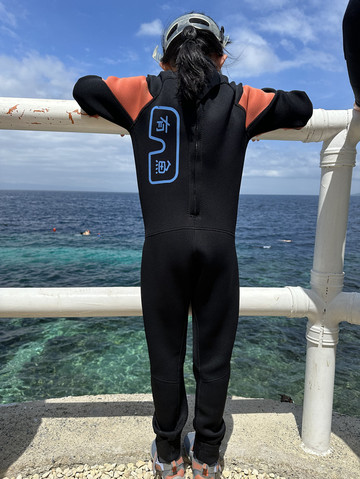 吃完早餐换好泳衣准备出发去深潜啦,先要去到另一个酒店的潜店,是中国人开的,先在里面学习理论知识,然后在泳池试练习,然后才能下海,安全问题还是比较看重的。挺不错。孩子8岁以上可以深潜,但宝贝还不到8岁,所以先让她尝试一下再说。