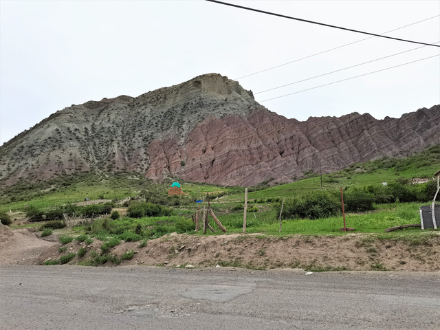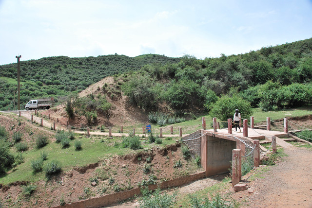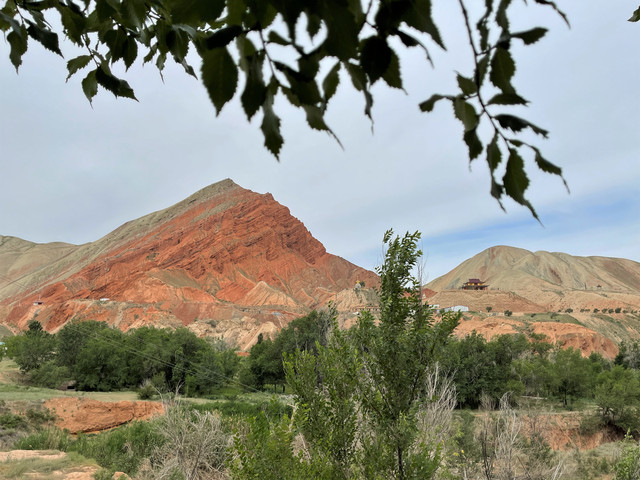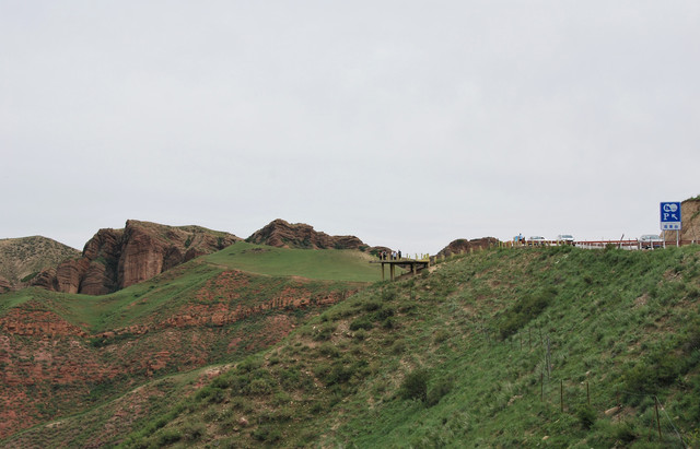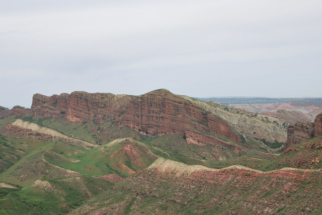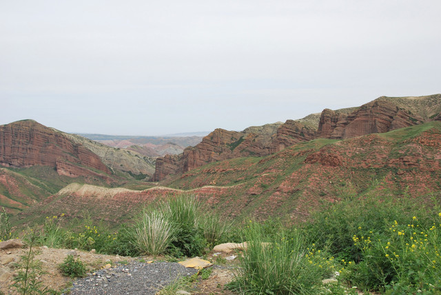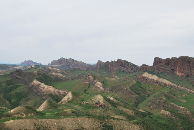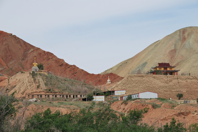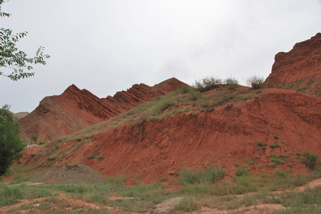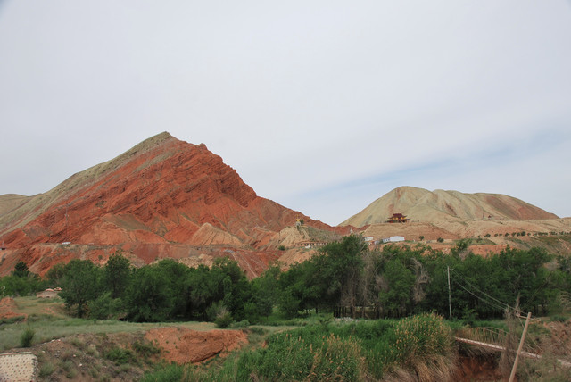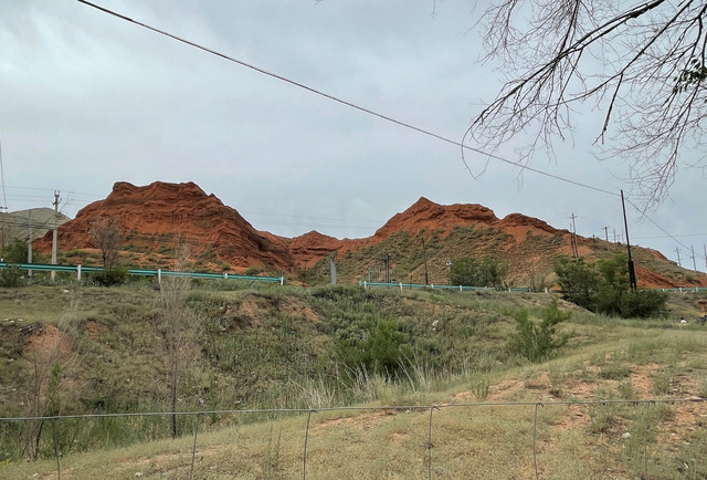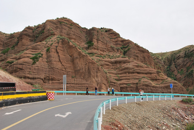 下了高速,开始的路还算不错,柏油路面,虽然不很宽。走着走着成了砂石路,而且颠簸不平,摇来晃去,很不舒服,司机称之为“烂路”。路虽不乍地,但风景的确不错。车行一段后,路旁出现了红色为主,间杂其他颜色的山体,颇似甘肃张掖的七彩丹霞山,令人眼前一亮。