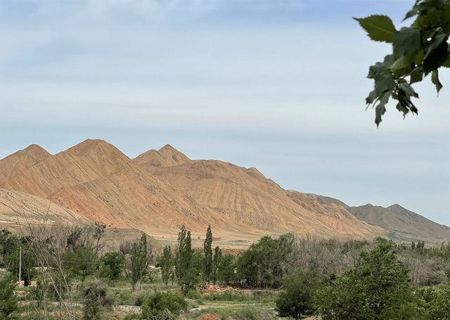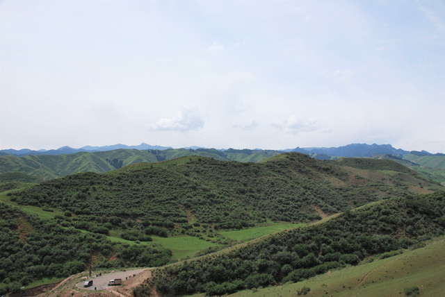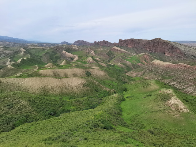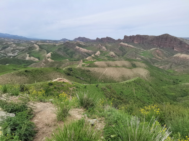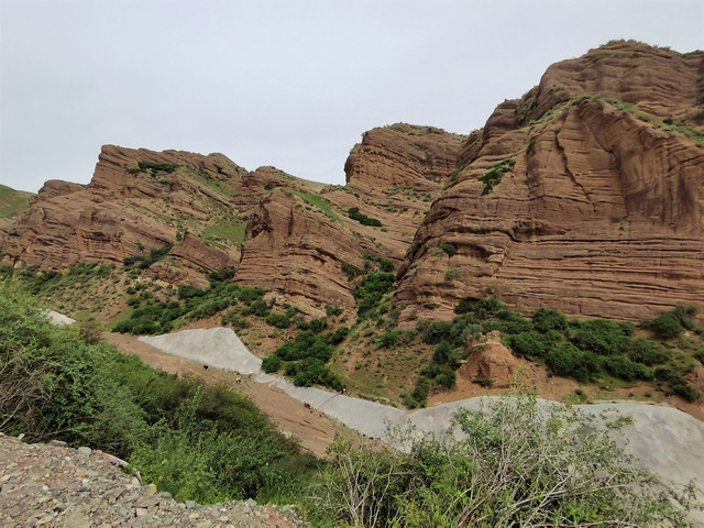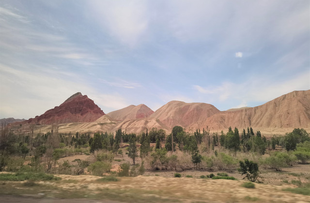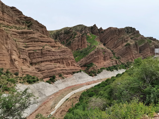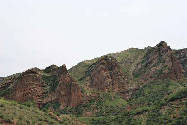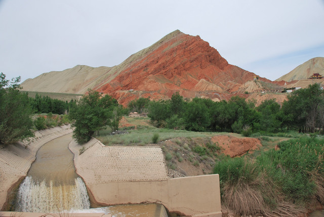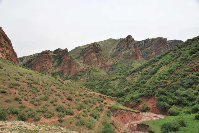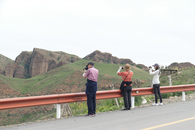 下了高速,开始的路还算不错,柏油路面,虽然不很宽。走着走着成了砂石路,而且颠簸不平,摇来晃去,很不舒服,司机称之为“烂路”。路虽不乍地,但风景的确不错。车行一段后,路旁出现了红色为主,间杂其他颜色的山体,颇似甘肃张掖的七彩丹霞山,令人眼前一亮。