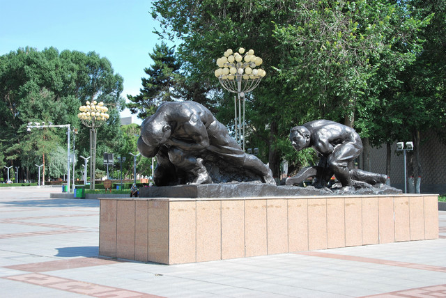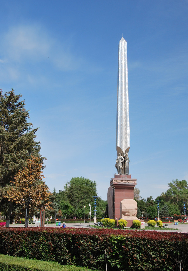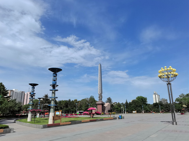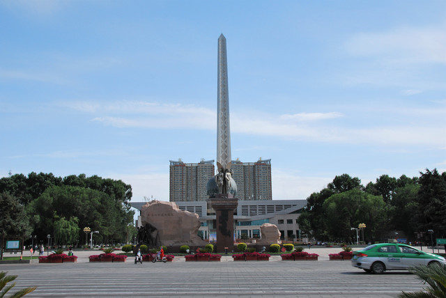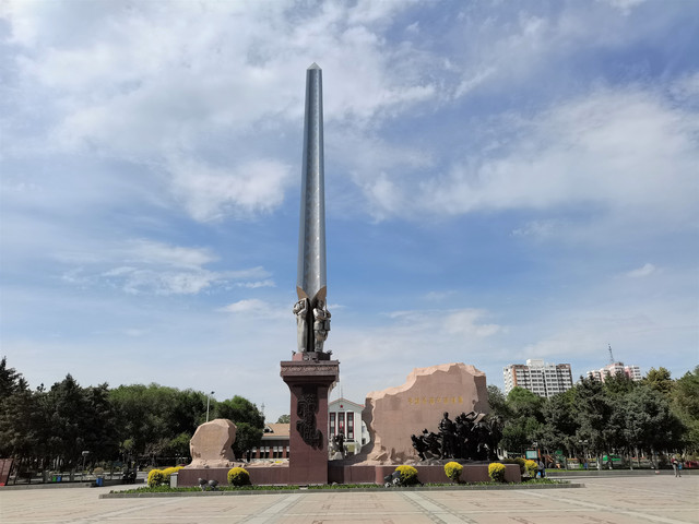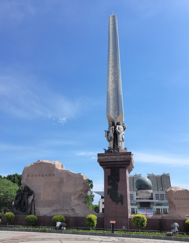 石河子军垦博物馆南面,就是石河子市中心的游憩广场,广场正中坐落着直刺云天的屯垦戍边纪念碑。