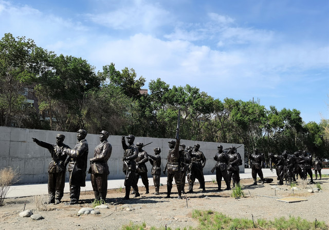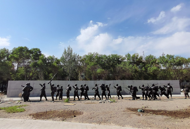 一组长群雕,有二十几个人物,背负肩扛武器,应该是表现解放大军进军新疆的场景。