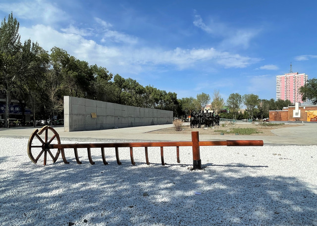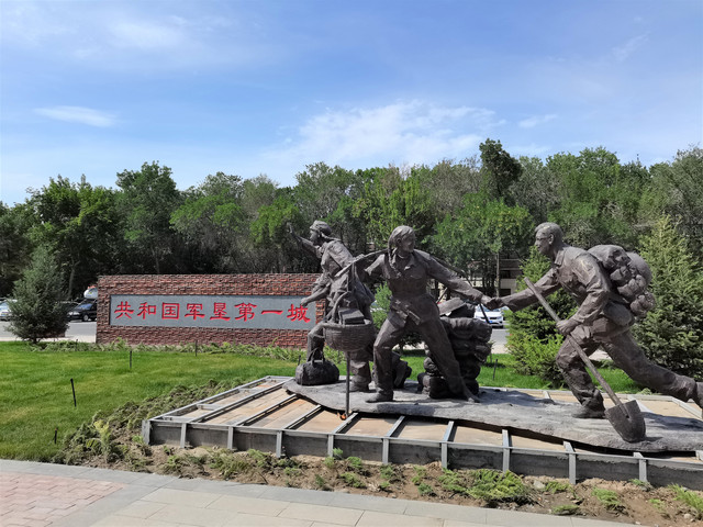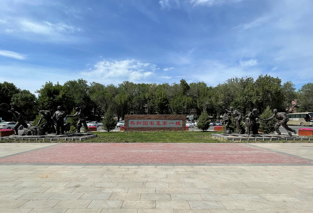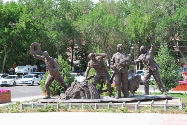 《军垦第一犁》雕像,主体为两人在前奋力拉犁,一人在后执掌铧犁,裸露的上身,原始的劳动工具和奋力向前的身姿,勾画出当年创业的艰难,成为这座城市永久的记忆。