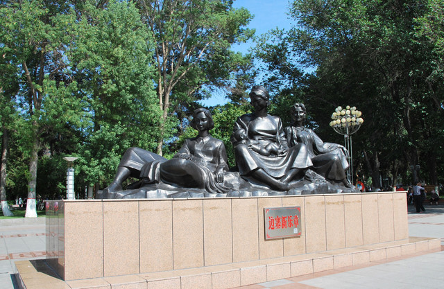 边塞新乐章群雕,中间怀抱婴儿的母亲代表着50年代初期来新疆兵团的山东、湖南女战士形象;那位留短发的年轻姑娘,代表着60年代参加兵团建设的上海、北京、天津、武汉等地的知识青年;维吾尔族姑娘则是兵团中少数民族战士的代表。