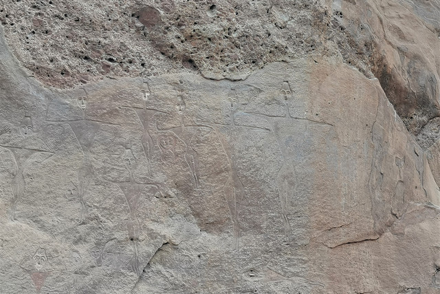 天山康家石门子岩壁画,位于呼图壁县西南部山区,岩画刻在一座高达200米的侏罗纪晚期丹霞地貌山体南侧的岩壁上,共刻绘着300多个大小不等、身姿各异的人物和动物。