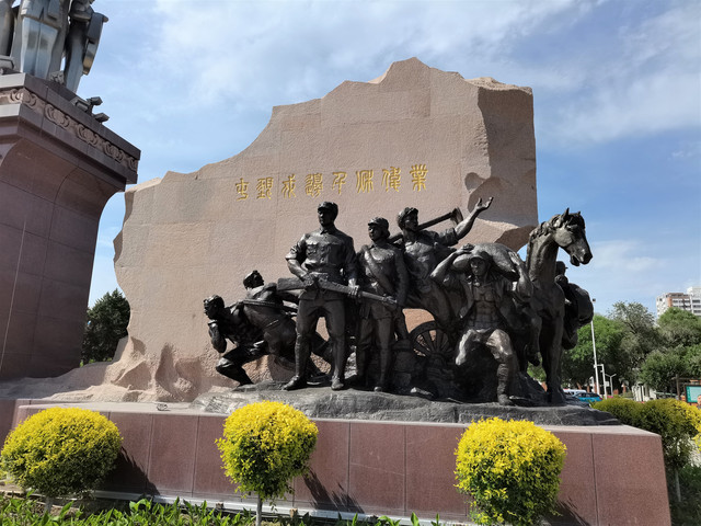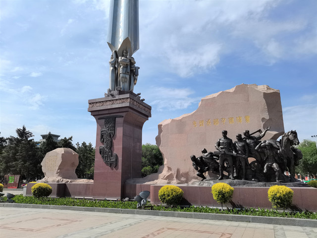 纪念碑东侧是一块象征新疆版图的花岗岩,正面写有“屯垦戍边,千秋伟业”八个金色大字,岩石下面是9名军垦战士的群体雕塑,代表着屯垦戍边的兵团三代人,有的奋力拉犁,有的手握钢枪,还有的扛着粮食、牵着羊羔和马匹,再现了屯垦戍边、艰苦奋斗的劳动场景。