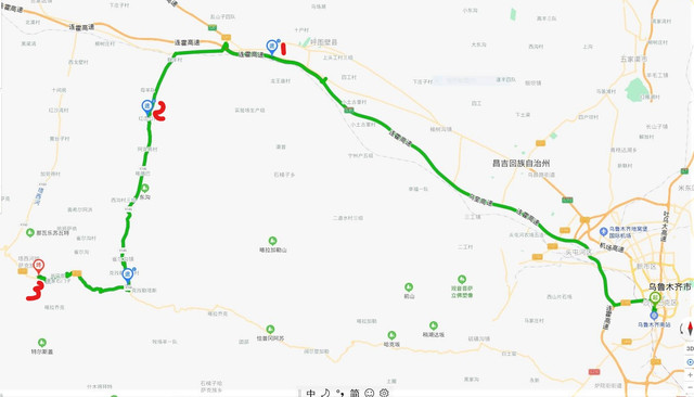 红色1为连霍高速五工台服务区,红色3为康家石门壁画。整条绿线是乌鲁木齐酒店到康家石门子岩画。