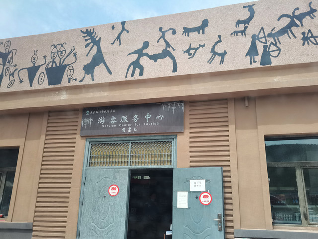 离开观景台,沿101公路继续西行,走了大约几公里的样子,就是康家石门子岩画景区,游客服务中心的牌子挺正规,房子周围的环境有点乱糟糟,似乎就是一个村民在路边收钱卖票,连一个正规的大门都没有。