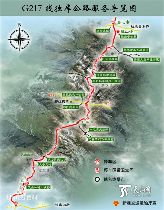 独库公路,北起克拉玛依市独山子区,纵贯天山南北,南端连接阿克苏地区库车市,全长561公里。由于其过半以上地段横亘崇山峻岭、穿越深川峡谷,连接了众多少数民族聚居区,被《中国国家地理》评选为“纵贯天山脊梁的景观大道”。独库公路地形特殊,急弯陡坡较多,有280多公里的路段在海拔2000米以上,受冬季降雪、结冰等自然因素影响,一年仅开放五个月,每年9月底到次年5月会实行长达7个月的冬季交通管制。