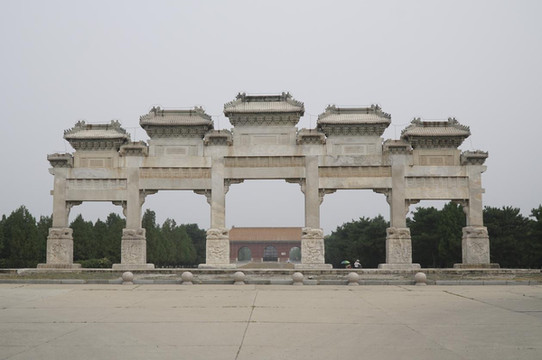 (清东陵最南端的孝陵石牌坊,中国现存面阔最宽,五间六柱十一楼仿木结构等级最高)