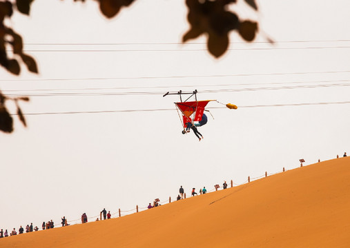 走完了沙坡头的玻璃桥,由于计划均已告吹,眼下无所事事,我们就再次来到滑沙场附近看热闹。此时,游客大军已相续抵达,人们在这里玩起了各种沙漠运动。于是,我们又有了新的任务,拍摄高空溜索越黄河、高空飞伞渡黄河。看来,沙坡头里不只有“大漠孤烟直,长河落日圆”;还有挑战自我,刺激又惊险的现代游戏。