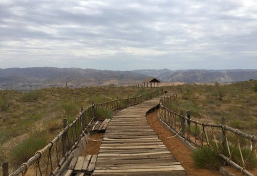 “向沙漠进军”,走过黄河观景台,就来到了去沙漠区(也称沙坡头北区)的观光车站,这里有两条路,一条是乘车(单程15元)去沙漠游览区,看沙漠、骑骆驼、玩沙漠冲浪、沙漠探险、沙地摩托和越野车等心跳的运动,另一条是沿着眼前的沙关古道(下图),从栈道上一路看大漠孤烟和大地苍茫,同样可以走到沙漠游览区,而且,走栈道免费。