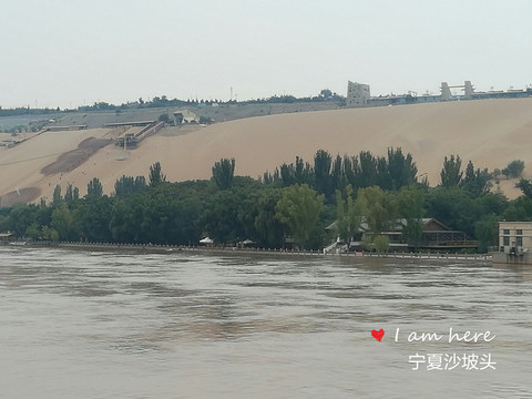 从黄河对岸看沙坡头,眼前别有一番景象,黄河边的那座坡形房屋就是黄河度假山庄,它就是我们“远方的家”,昨天夜里,我们听着黄河波涛的声音,度过了一个美好的沙坡头之夜!