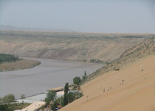 “天下黄河富宁夏”,对面就是宁夏黄河绿洲,原本打算渡过黄河前去绿洲看一看,看它究竟有多富。现在也只能隔河相望了。今天,不但黄河没日出,而且,天空还灰蒙蒙的。大概是计划连连受挫,感觉眼前的沙坡头景色就没有昨天抢眼。尽管如此,我们还是一路沿着黄河,去寻找这条母亲河的看点。