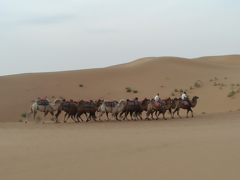 我们不知不觉,已在沙漠里走了数个小时,此刻,沙漠里没有了太阳的踪影,一派天茫茫、沙茫茫,天空云汉低垂,沙漠里非常的冷。驼工们已忙着收工,领着他们浩浩荡荡的驼队走向归途。看来,今天“大漠日落圆”有点悬。不管怎样,既来之、则等之,我们走到沙漠游览区的最西面,在此架好相机,把镜头对准了走向日落的方向的驼队,只等晚霞余晖出现的那一刻。