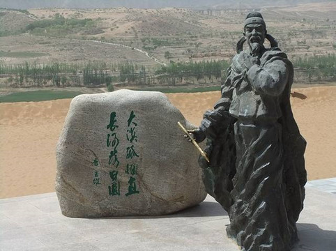 “单车欲问边,属国过居延。征蓬出汉塞,归雁入胡天。大漠孤烟直,长河落日圆。萧关逢侯骑,都护在燕然”。这是唐代诗人王维的千古名篇《使至塞上》。诗的主题就镌刻在沙坡头的黄河观景台上,眼前的塑像就是唐代著名诗人王维。名士就是名士,胸中有国有家,一副大义凛然之气!