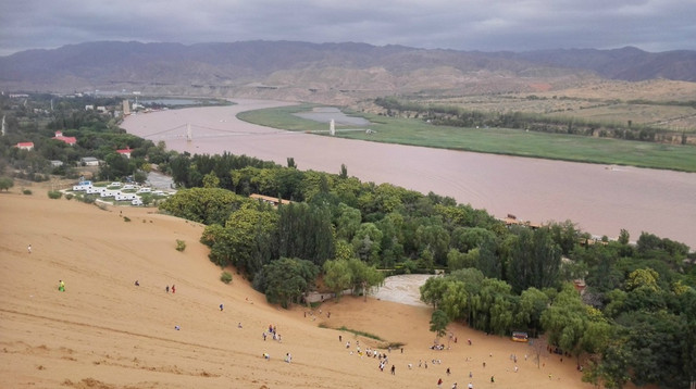 9月25日早晨,沙坡头的天气依然阴沉,我们的观“长河晨曦日出”又泡汤了。在酒店安享了一顿丰富的早餐后,我们来到黄河边,准备乘坐羊皮筏子渡黄河。也许是没做功课,到了皮筏渡口,这里栅栏紧锁,没见到一个人,原本以为来到太早,走回酒店才知道,眼下黄河正值汛期,所有水上游乐项目(从皮筏到游艇)全部被暂停。看来,我们的计划尽管好,只是功课没做好。