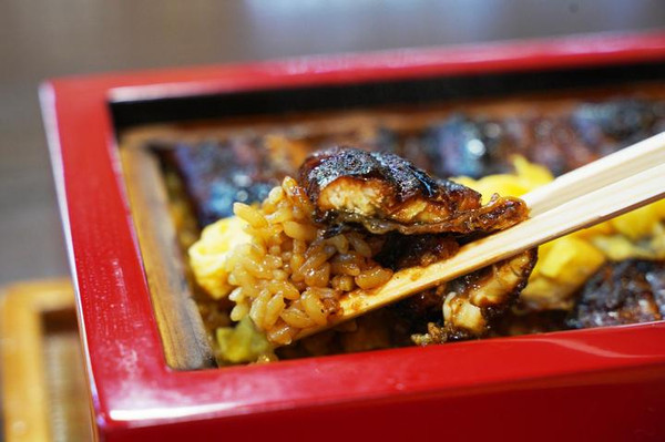 我们点的是“蒸鳗鱼定食”,打开红色漆器盒盖,一股淡淡的蒸汽扑面而出,同时也伴随着一股浓浓的鳗鱼香。浸满褐色酱汁的米饭上普铺着大片鳗鱼,鸡蛋下面还垫着一大片鳗鱼。这是店内最大份量的鳗鱼饭,压在下面的米饭吸足了汤汁,别提多香了。