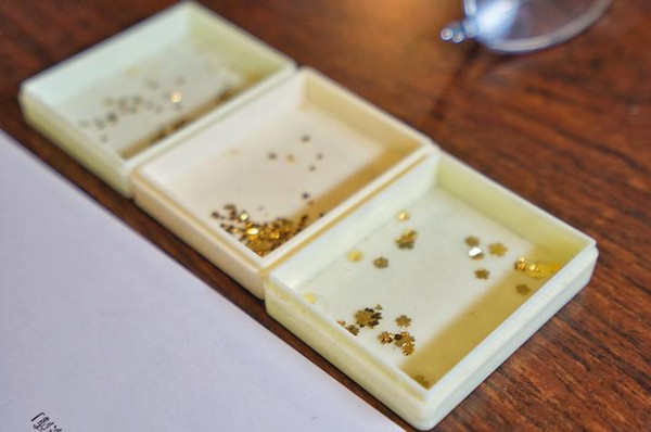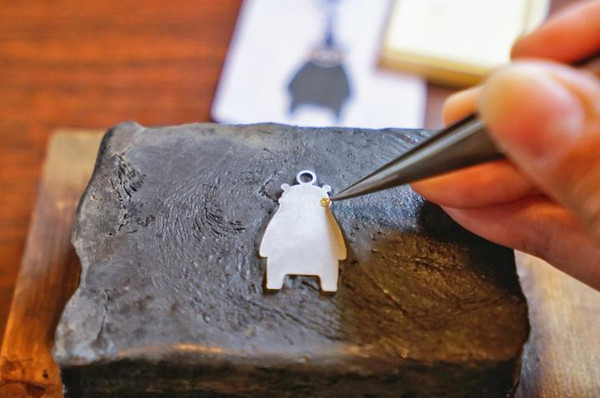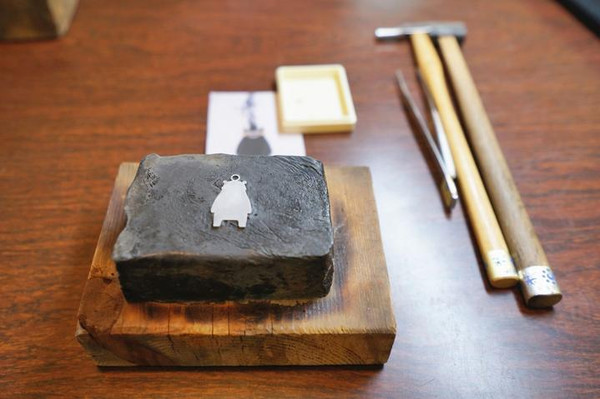 将小小的纯金和纯银饰物,用镊子小心地放在熊形铁板上后,接着再用小槌仔细地敲打。
