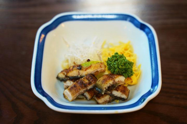 定食里还包含另外两种鳗鱼菜品,分别是醋腌的鳗鱼凉菜和白烧鳗鱼。白烧顾名思义就是不加酱料烤制的鳗鱼,体现了鳗鱼的原味。本吉屋不愧为柳川最出名的鳗鱼饭店家,充满仪式感的用餐环境和深巷寻香的过程,以及超高品质的鳗鱼饭,都给人带来无尽回味。