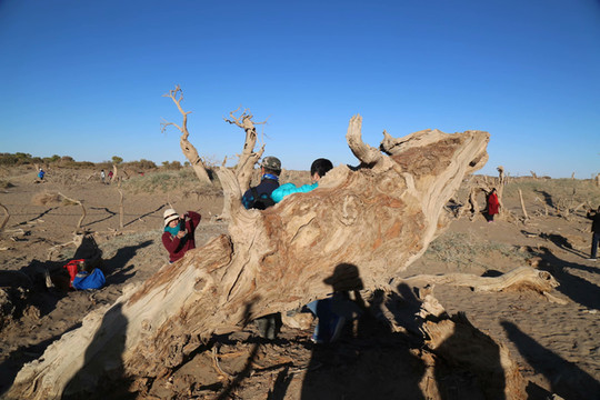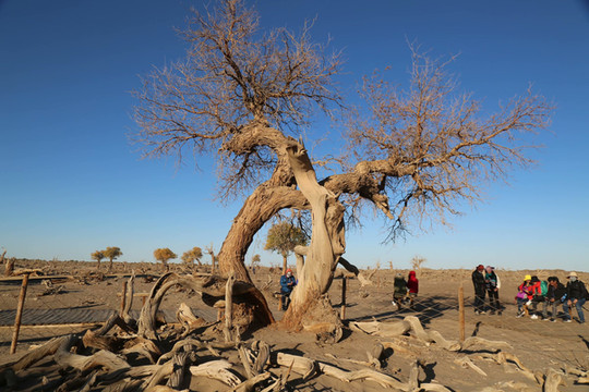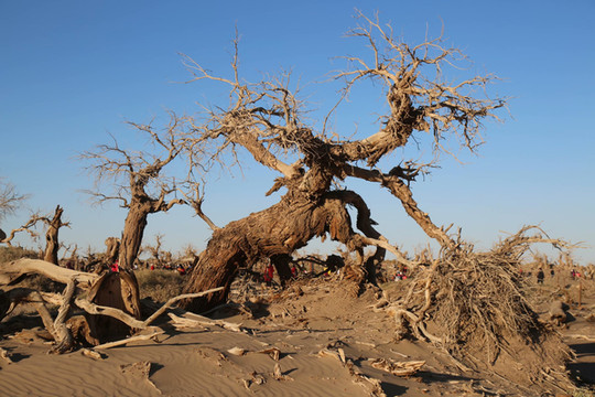 走出古城遗址,搭乘景区交通车,行驶十几公里,就来到了怪树林。这是一块东西宽、南北长的辽阔地带,大片的胡杨林因缺水而枯死。干枯的树枝扭曲着,挣扎着,树干崩裂出千奇百怪的纹路,仿佛生命结束前的最后一秒,干渴的姿态被永远定格下来。粗大的树干,像是被无形的力量挤压的,再也挤不出一点生机。偏偏就是这些枯树,充满了生命的感召力,像是一场盛大的怪树聚会,每棵树都手舞足蹈,姿态万千。在这里找不到相似的形态,每一棵树都用自己独特的方式诉说着生与死的永恒,诠释了胡杨“生而一千年不死、死而一千年不倒、倒而一千年不朽”的光辉品格。