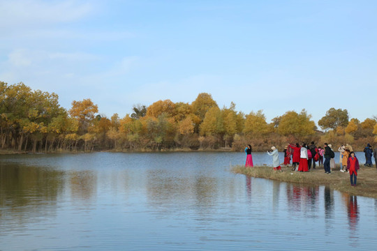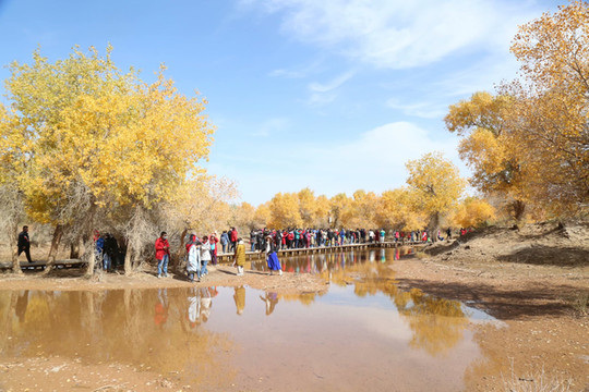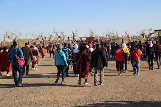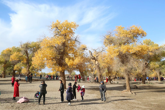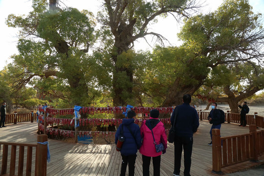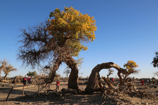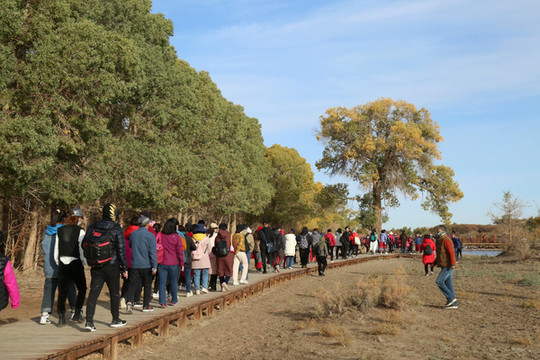 4日是自由行摄的一天,摄影师全程陪同。8点钟来到景区入口时,人头攒动,游人已经排成了游动的长龙。造型源自两棵千年胡杨、守望相助姿态的M门,似土尔扈特部落圣洁的哈达,又像草原上展翅飞翔的雄鹰,欢迎我们的到来。这里是胡杨的故乡,有胡杨林45万亩,现已开发312省道以南15万亩,景区全长28公里。蒙古语称胡杨为陶来,我们沿着一道桥陶来林、二道桥倒影林、四道桥英雄林、七道桥梦境林和八道桥沙海王国的路线,交通车和双脚并用,时走时车,或赏或摄,行游如同梦境。