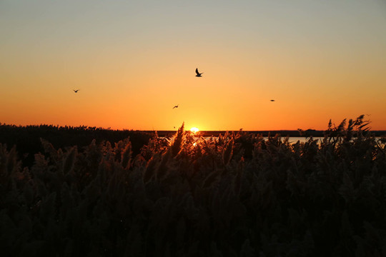 纳林湖是巴彦淖尔著名景区,内蒙古西部第二大淡水湖和重要湿地,湖泊呈不规则半月形,湖内有大小岛屿十余处,湖里长有茂密的芦苇,有百余种候鸟在这里生长繁殖。湖的北岸是连绵起伏的沙丘,南岸栽种千亩胡杨树,纳林湖恰似一颗璀璨的明珠,镶嵌在乌兰布和沙漠之中。波光潋滟,水天一色,春秋两季多种珍禽异鸟翩然而至,成为大漠中的一道风景线。6日凌晨6点从敖伦布拉格出发,先自行进入景区拍摄日出,再坐游船荡漾湖面。湖水凝碧,苇丝含烟,初升的太阳,把如镜的平湖染成一片金红。