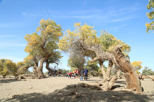 梦境林是胡杨最早变黄的地方,每年春夏之交,她们最先感受到春意,伸出嫩绿的枝芽,唤醒千年胡杨生命的开始;倒影林在晨光熹微中等待日出,两岸的胡杨似乎还在沉沉睡梦里,湖水静静地流淌着与胡杨相互交融,形成最美胡杨倒影;英雄林是千年胡杨最集中的片区,树干粗壮巨大,鬼斧神工的形态,宛如无数土尔扈特东归英雄的化身,铭刻了人类历史上一次悲壮的民族大迁徙。额济纳胡杨林有着最美秋色之称,每年这个时候,都有无数游人从各地慕名而来,仿佛赴约一般虔诚。人们欣赏这戈壁沙滩上桀骜不驯的生命之树,为她的顽强折服,而这里的胡杨静谧地维护着秋的尊严,在历史的尘埃中不卑不亢,注解了一曲动人的生命史诗。