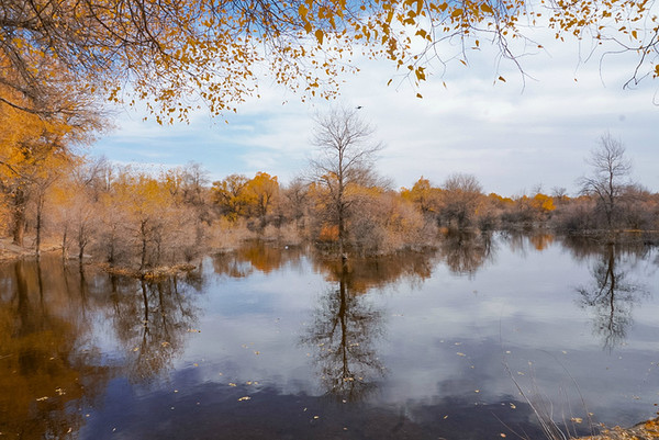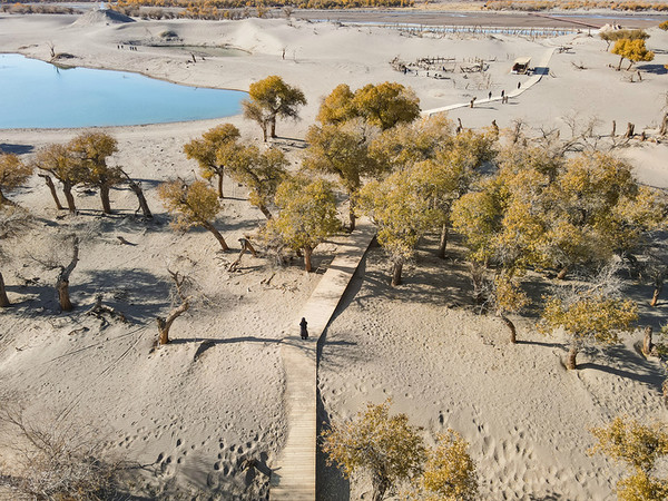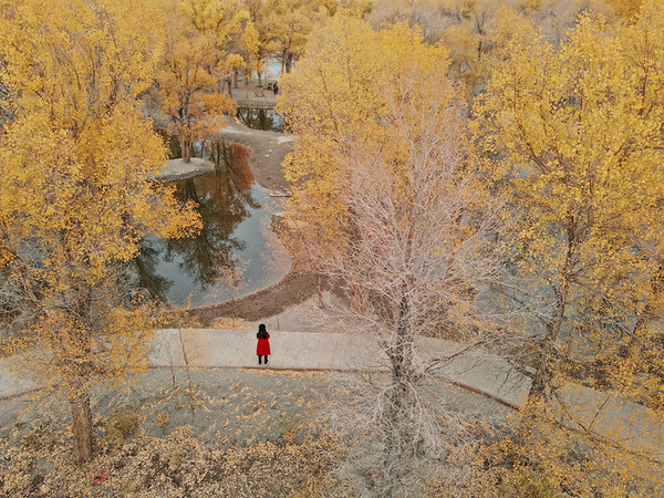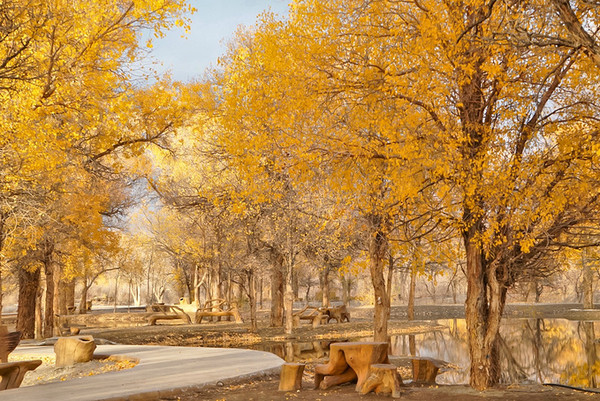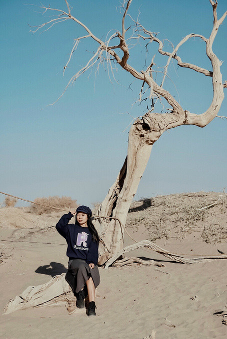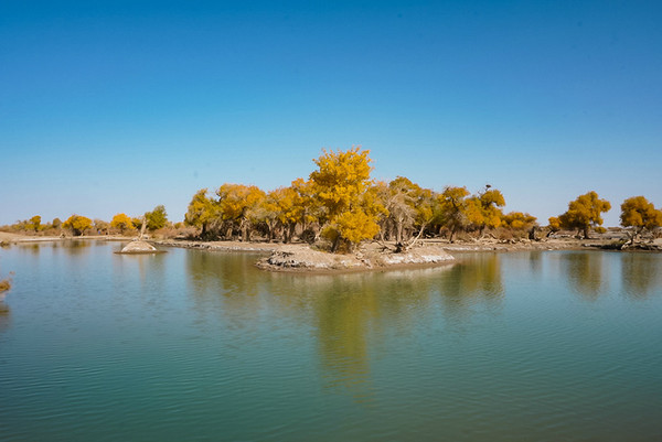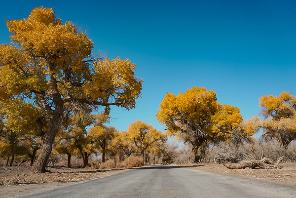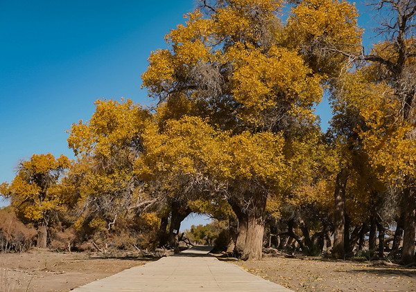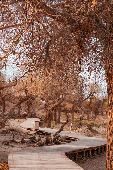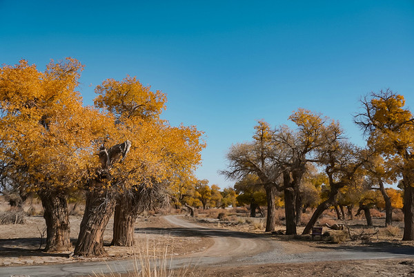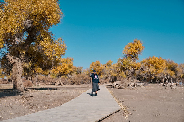 跟随着景区的区间车从二道桥一直到八道桥,算是把景区都逛了一遍。走在景区里,看着碧蓝的天空下,还有一些胡杨挂满金黄色的叶子,像不愿掉落一样紧紧地与树枝粘在一起。地下却已是一地落叶,新生与凋落就是这样循环,每一次的枯萎都会是新生的轮回。绽放中的胡杨固然美丽,凋落中的胡杨更加有生命力。