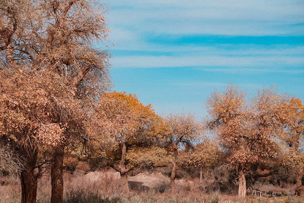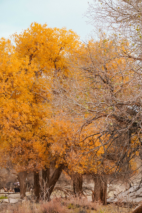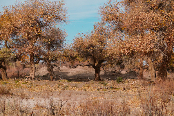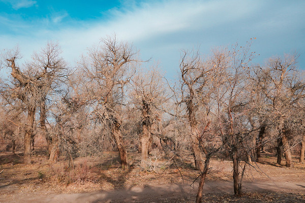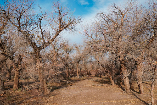 我们寻找胡杨林秋色的第三站来到了额济纳旗胡杨林景区,但10月底的额济纳旗已经是胡杨的尾声了,到了景区才发现里面的胡杨基本已经凋落得差不多了,当时很多人说我们都已经错过了胡杨的最佳观赏期,根本不需要去。