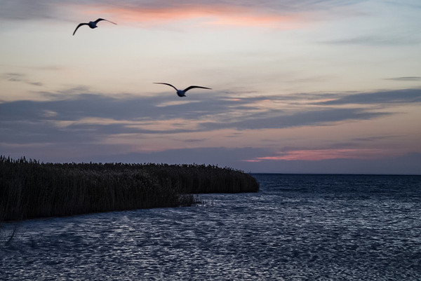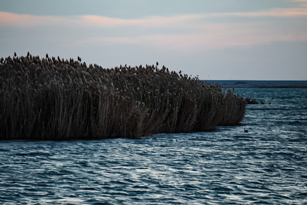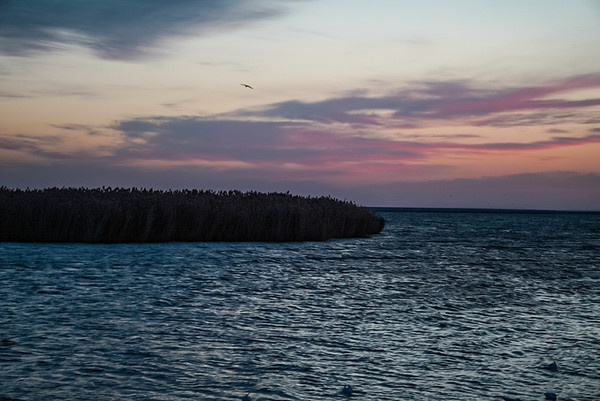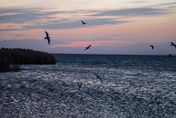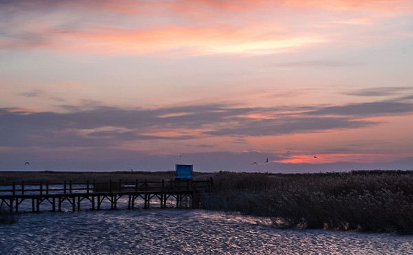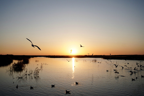 等待日出的过程是辛苦的,但看着眼前的一番景色,也值了!湖水、芦苇、大雁呈现在眼前,海鸥也在眼前划过,飞翔在芦苇上空,湖面碧波荡漾,映着湖中随风摇曳的芦苇,水草,映着天边的那抹绯红,好一幅动人的画面。