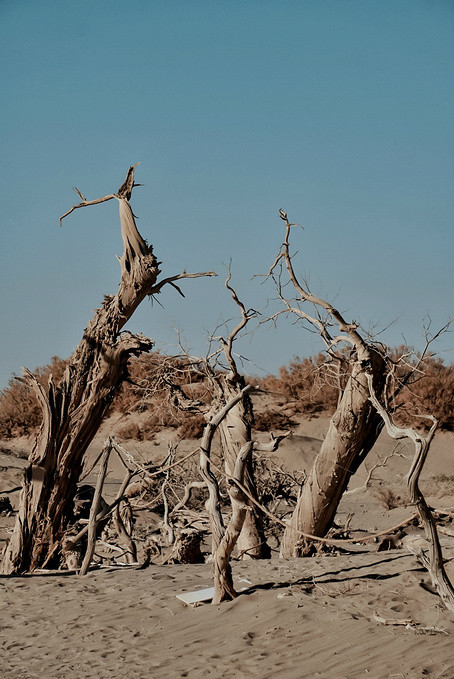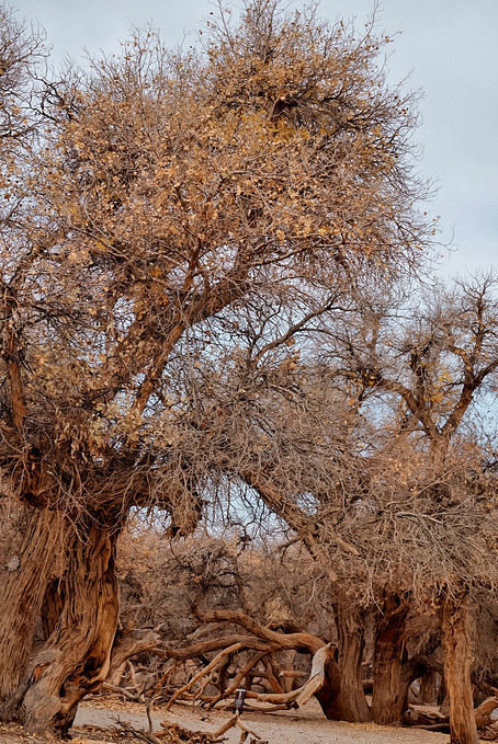 我相信很多人都见过胡杨盛放期的样子,但却很少人见过胡杨尾声的样子。一般大家都会选择最佳观赏期到来,就为了见一眼胡杨最美的秋色。如果不是这个时间来到,我也不会见到现在凋落的胡杨。