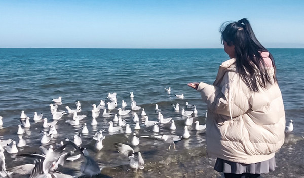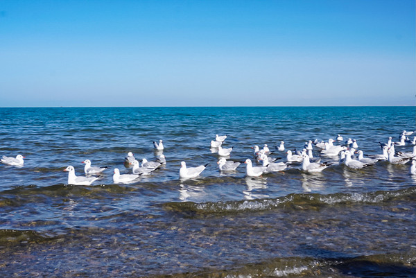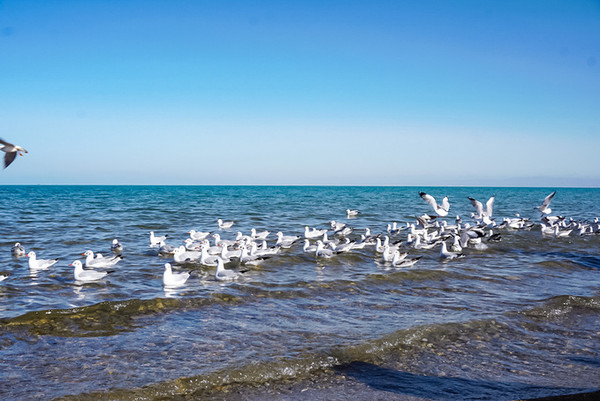 站在湛蓝的湖边,看着微风拂过湖面泛起鱼鳞般的波纹,看着湖水荡漾到湖边又退回去,看着可爱的海鸥在空中翱翔,在湖面嬉戏......这一切的一切,都为青海湖增添了几分生机。