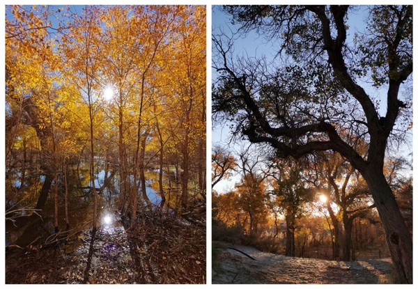 一道桥另一处妙景是恋影林,让人如入画中,每一棵胡杨都是一位有着倾世容颜的美女,向世人展示婀娜多姿的背影,绽放这一世的妖娆。