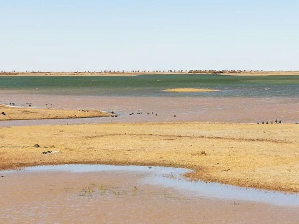 邻近小镇又看到一座水库——沙日淖尔水库,水位较低,露出大片荒滩。看来要在戈壁滩上留住湖泊,是一件不容易的事情。所以河西走廊一路所遇到的榆林河水库、双塔水库以及居延海公园湖水和居延海,都是难得一遇的奇景。如果你走一趟戈壁,就能体会到那种荒野中看到水的惊喜。