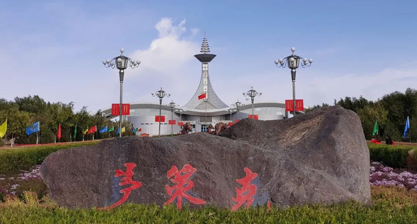 景区入口就在达来呼布镇东部,十分近便。景区的M形大门独具匠心,这个造型源自景区内两株千年胡杨守望相助的姿态,也寓意草原雄鹰展翅高飞,又像一条哈达,欢迎远道而来的游客。