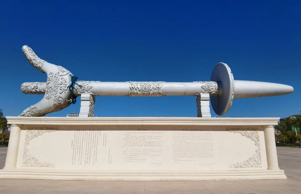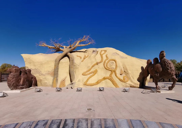 公园里有一根“蒙根不勒”雕塑,“布勒”蒙语意为鼻棍,“蒙根不勒”是银质鼻棍的意思,是驯化骆驼的重要工具。