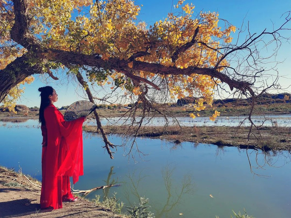 10月5日到达额济纳,2021年的黄叶却比以往时候来得更晚了一些。额济纳胡杨林景区有一个漂亮小姐姐叫“胡杨公主”,每天都会直播胡杨林颜色变化,5号不够黄,6号依然不够黄,7号还是不够,8号差点意思,这天是9号,火候差不多了。但不着急,再炖一炖,10号来品。