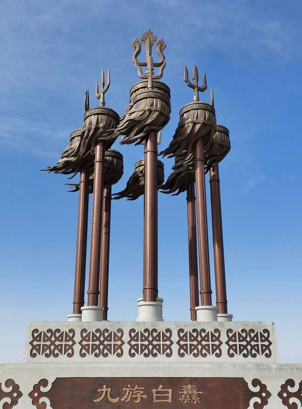 下图为蒙元文化广场上的九斿白纛。九斿白纛由成吉思汗所创立,蒙元之后成为蒙古的权利象征,各部酋长均有各自的苏勒定(军旗上的铁矛头)。白纛的形象在原蒙古势力范围的国家中大都留有印记,如乌克兰等国国徽中就有白纛元素。作为权利的象征,部长酋长一般会设立专门的守护卫队,并在外出时随行协带,一般由一匹白马陀行。