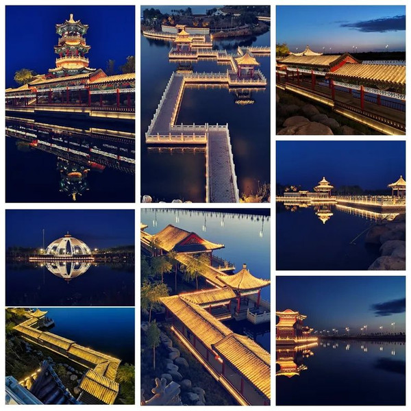 晚霞染红的云在湖水的倒映下如堤岸长出的翅膀,夜幕降临后水天一色,楼阁灯火辉煌,汉式传统廊庑曲折回环,蒙族穹顶圆帐圆润靓丽,景色浪漫又奇丽。