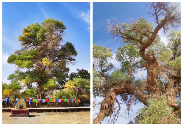 神树高27米,主干直径2.06米,树围6.5米,树干需6人才能合围。神树为胡杨树,据专家说树龄已达800年,是额济纳胡杨林中个头最大、树龄最老的一株,真的是应了胡杨“生而千年不死”的称赞。之所以称为“神树”,是因为当地人相信神树会实现他们虔诚的祷告,并保佑这里风调雨顺、草畜兴旺。