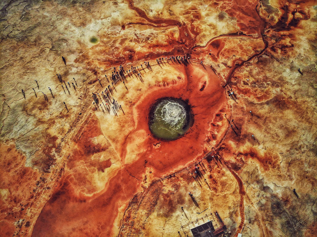我称它为“无人机之眼”,因为只有使用无人机才能拍出它的美,从空中俯瞰,泉眼与喷涌出的泉水以及周围土地上深红色环带状的沉淀物,组成了一个奇特的瞳孔造型,仿佛一只镶嵌在大地上的眼睛。景区大门到艾肯泉边需徒步20分钟左右,都是平坦的草地和湿草地,行走时一定要注意安全哦。