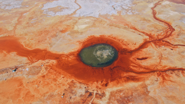 艾肯泉位于青海省海西蒙古族藏族自治州茫崖市花土沟镇莫合尔布鲁克村,被称为“大地之眼”、“恶魔之眼”。艾肯泉直径有10多米,泉眼如同沸腾的开水,不断翻滚上涌,泉眼周围硫磺矿物质长期沉淀,色彩斑斓。 从空中俯瞰,泉眼周围由于长年硫磺沉淀形成了多样优美的图画,大自然的鬼斧神工令人叹为观止。