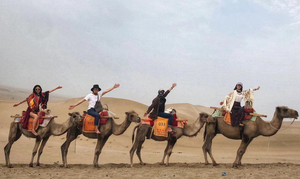 第四天 敦煌鸣沙山-回客栈-莫高窟($200,因为门票是不同时间断的,所以师傅会在不同的时间送过去,至少提前一个月预定门票,实在没有师傅会帮忙搞应急票)-鸣沙山月牙泉(就在露营的沙漠背面,一个月牙形的湖坐落在沙漠里,可以去骑骆驼坐热气球等,当然了价格也算是一路上比较贵的,如果去露营过不建议去价格比较贵,而且可以好好地休息一下午)-敦煌(住宿$120,从这个时候住宿都比较便宜并且环境特别好了)