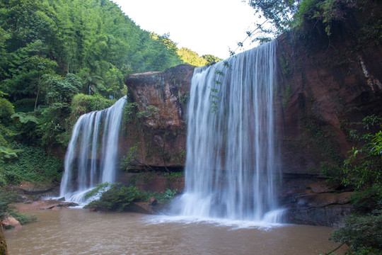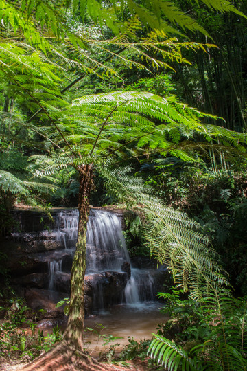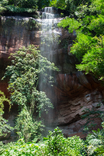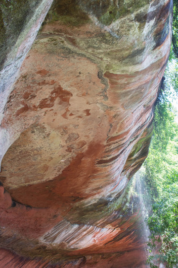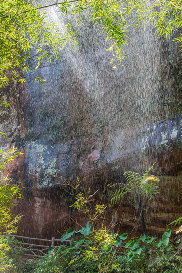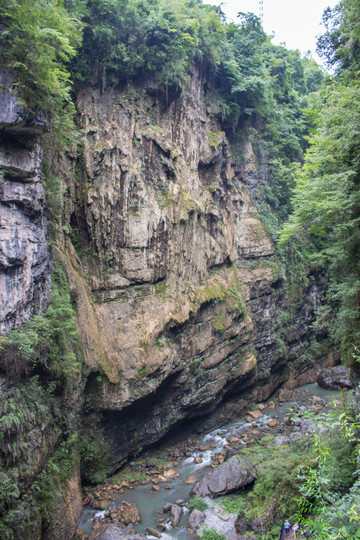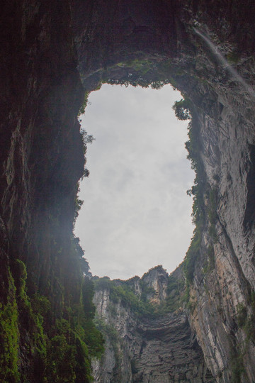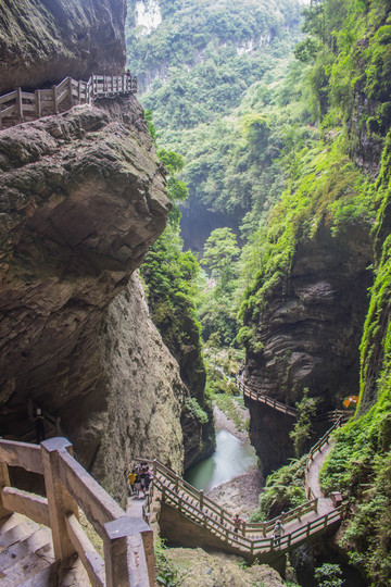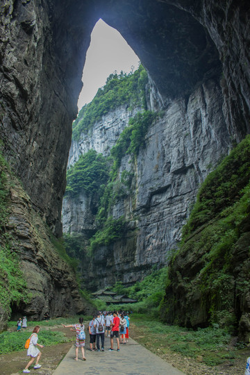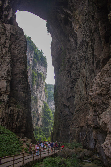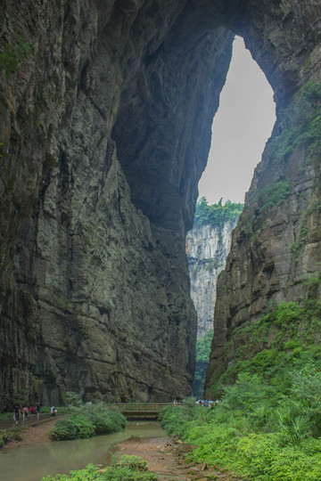 半个多小时方才到达天坑底部。第一个天坑名为天生天坑,坑底地势平坦,芳草萋萋、翠竹森森,一条小河窜出地面,蜿蜒流淌,一挂飞瀑跳出山崖,跌落坑底。“天福官驿”掩映在翠竹之中,四周岩石峥嵘,有一种阴森萧煞之气氛。“擎天柱”矗立在草坪之上,威风凛凛,有一种置之死地而后生的英雄气概。这里曾经是张艺谋《满城尽带黄金甲》和迈克尔·贝《变形金刚4》等电影的取景地。走到天生天坑中间的步道上,方才见其全貌:天坑一侧平缓,一侧陡峭,两边被飞龙桥和青龙桥锁住。飞龙桥为羊水河峡谷上的第一座天生桥,又名头道桥,高大厚重、气势磅礴,以雄壮称奇。青龙桥为羊水河峡谷上的第二座天生桥,又名中龙桥,因雨后飞瀑自桥面倾泻成雾,日照成彩虹,似青龙扶摇直上而得名。过青龙桥,便进入了飞鹰天坑,所谓飞鹰天坑,因青龙桥如展翅欲飞的飞鹰得名。穿过飞鹰天坑,便是黑龙桥了,黑龙桥为羊水河峡谷上位置最下游的天生桥,拱洞幽深暗黑,似有一条黑龙蜿蜒于洞顶,洞壁北侧发育有雾泉、珍珠泉、一线泉、三迭泉等4处悬挂泉,风格迥异,妙趣横生。这便是天生三桥,形成了“三桥夹两坑”的独特地质奇观。