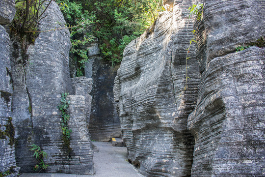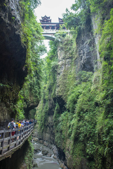 乘坐摆渡车在地缝景点下,游客早已排起了长龙。进检票口,过廊桥,下到地缝中的挂壁栈道,沿栈道参观地缝,景物趣味类似武隆龙水峡地缝。
