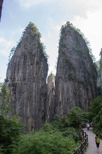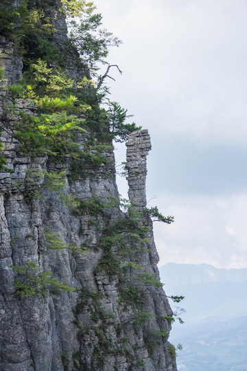 七星寨是典型的山岳风光,喀斯特地貌。沿着悬崖上的栈道攀登七星寨,视野越来越开阔,风景越来越美丽。突然,一根岩柱从峭壁上生长出来,孤峰独立,直指碧空,看似挡住了我们去路。峰回路转,才从夹缝中穿过,登到山顶。登高俯瞰,孤峰近在眼底,野百合兀自在峰顶开着淡黄色的花,恩施松斜插在石缝间,虬枝苍劲。眺望远方,来时的公路“之”形消失在山顶;清江水在峡谷穿行,投奔恩施城而去;两岸山峰起起伏伏,姿态万千;山麓散落各式各样的土家民居,与自然和谐共生。山顶的步道九曲十八弯,穿行在石林、峰丛、崖缝中。一路缓行,一路有景:“悬棺高升”、“悬崖栈道”、“祥云火炬”、“迎客松”、“象首山”……约莫2—3小时,太阳西斜,山路下行,看来已经是归途了,但这才是见证奇迹的时刻!穿过石缝,走下石阶,听得前方人声嘈杂。转过一巨石,眼前突然一亮,只见一石柱上大下小,如一炷香般插立与两峰之间。夕阳西下,斜辉洒落在石柱上,熠熠发光。这就是标志性景点“一炷香”。过“一炷香”,便是“双子塔”,两峰如同印度尼西亚的“双子塔”,从两塔之间望出去,恩施大峡谷在夕阳下披上了金色的外纱,真是“江山如此多娇”呀。过“双子塔”,又见“母子情深”,一家三口意犹未尽,踏上归途,去往恩施城。