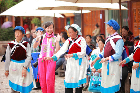 在四方街上,看到很多纳西族的爷爷奶奶们在随着音乐起舞,风雨无阻我硬生生的闯入她们的队伍中,老奶奶很是奇怪的看着我